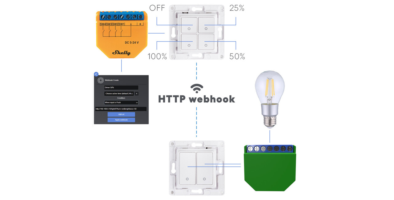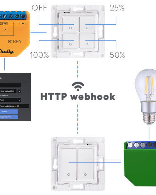 Furthermore, you can use Shelly Plus i4 DC to set the light color you want or for dimming of your smart bulbs. All you have to do is add and configure one of our scripts or webhooks created specifically for Shelly Plus i4 DC.
