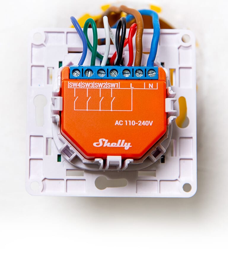 Shelly Plus i4 allows you to manually activate or deactivate any created scene, run synchronized actions, or execute complex trigger scenarios. Shelly Plus i4 is an input reader device (it does not contain relays).